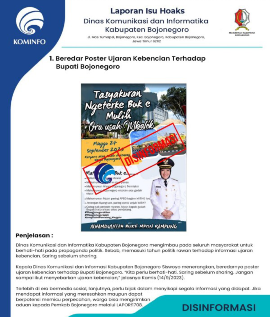 Kepala Dinas Komunikasi dan Informasi Kabupaten Bojonegoro Siswoyo menerangkan, baru – baru ini beredar poster ujaran kebencian terhadap Bupati Bojonegoro.“ Kita perlu berhati – hati. Saring sebelum sharing. Jangan sampai ikut menyebarkan ujaran kebencian,” bebernya Kamis ( 14/9/2023 ).