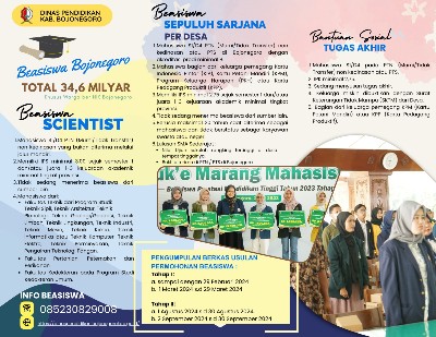 Sekretaris Dinas Pendidikan Kabupaten Bojonegoro, Lukiswati menjelaskan program beasiswa tahun ini tidak jauh beda dengan tahun – tahun sebelumnya. Yakni ada tiga jenis beasiwa, diantaranya Beasiswa Scientist, Beasiswa 10 sarjana per Desa, dan bantuan sosial tugas akhir. Program ini diperuntukkan bagi warga ber NIK Bojonegoro.